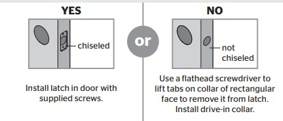Check if the door edge is chiseled. If yes, take the supplied screws to install the latch.