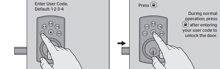 1. Press the default user code(1-2-3-4). Then push the lock button. The door will successfully unlock.